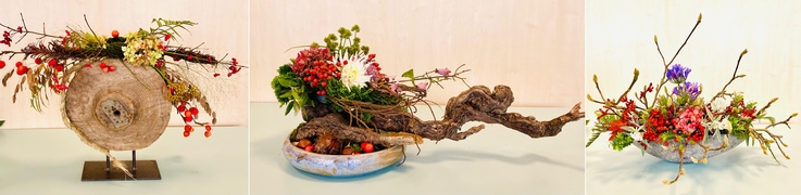 De presentatie deze middag gaat over de natuur in een van de grootste laagveen moerasgebieden in Noord-west Europa in de kop van Overijssel. Het is een product van menselijke activiteit in de oude verveningsgebieden. Eeuwenlang werd hier turf gewonnen. De veenspecie werd op smalle stroken land te drogen gelegd. Men noemde dit een ‘ribbe’. Daar waar het veen opgebaggerd werd ontstond een langwerpige plas water, die men een ’weer’ noemde. Voeg je deze twee namen samen, dan krijg de naam van het huidige gebied: De Weerribben. Voor meer informatie klik HIER.  Bloemschikken op houtBloemschikken op 6 november onder leiding van Ilse Kerkmeijer De opdracht voor deze keer was om een mooi stuk hout of een houten voorwerp mee te nemen en te voorzien van een bloemstuk welke qua stijl past bij de ondergrond. Bijvoorbeeld op een stronk verwerk je natuurlijke materialen die ook in het bos voorkomen.