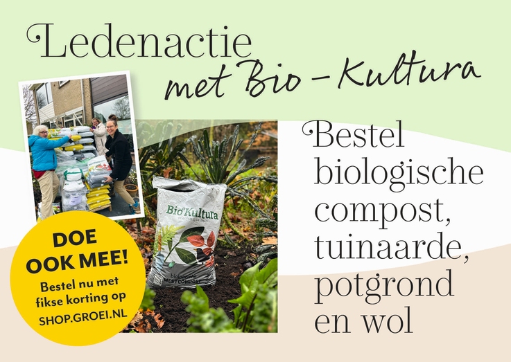 Beschikbare producten met scherpe ledenkorting: ✔️ Biologische mestcompost (40 l): voor langdurige voeding van de bodem ✔️ Biologische tuinaardecompost (40 l): voor een vruchtbare bodem ✔️ Biologische potgrond (40 l): gezonde basis voor je planten ✔️ Kleimineralen (20 kg): extra bodemstructuur en vochtvasthoudend ✔️ Schapenwol (3 m² en 70 m²): natuurlijke isolatie voor je tuin Bestellen kan tot vrijdag 23 januari 2026, zolang de voorraad strekt! Ga naar de webshop: shop.groei.nl/login Nog geen lid van Groei & Bloei? Sluit je dan nu aan: https://groei.nl/word-lid-van-groei-bloei  Onze sponsorsMeer informatie op onze website. Klik HIER