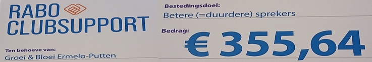 Van de penningmeesterHierbij wil ik als penningmeester van Groei & Bloei afd. Ermelo – Putten een dankwoord uitspreken. Wij hadden als bestuur besloten om dit jaar eens mee te doen aan de Rabo clubsupport actie. Begin september hebben wij de mensen, die een Raborekening hebben (en daarnaast zich hebben aangemeld als lid van de Rabobank) gevraagd om een stem op ons uit te brengen. Begin oktober werden wij uitgenodigd om in de sportkantine van IJsselmeervogels te Spakenburg de uitslag op te halen. Hier mochten wij gezamenlijk onze eigen enveloppe openen om te zien wat de hoogte was van deze Rabo clubsupport actie voor onze vereniging. Ik als penningmeester was blij verrast, dat wij onderstaand bedrag toegeschreven kregen. Alle personen, die op ons gestemd hebben, wil ik hierbij hartelijk bedanken. Dit geldbedrag is inmiddels bijgeschreven op onze rekening en zal worden gebruikt om onze activiteiten ook in de toekomst voort te zetten en waar mogelijk te verbeteren of verfraaien.